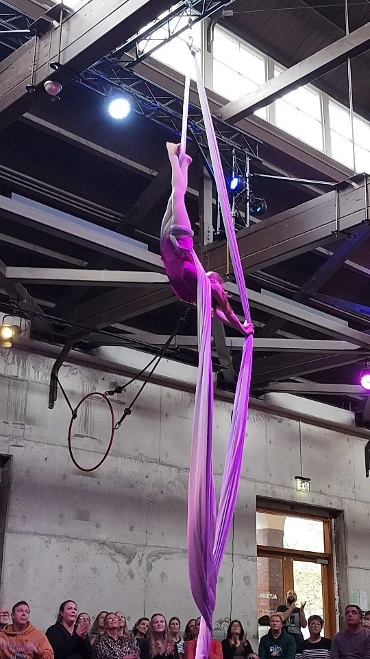 Aerial is the circus art of hanging upside down and moving through the air on different apparatus such as Silks, Lyra Hammock & Trapeze.